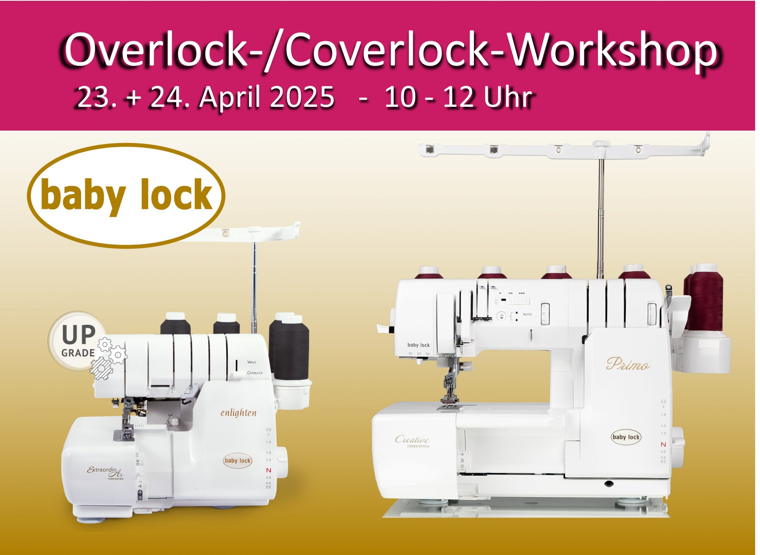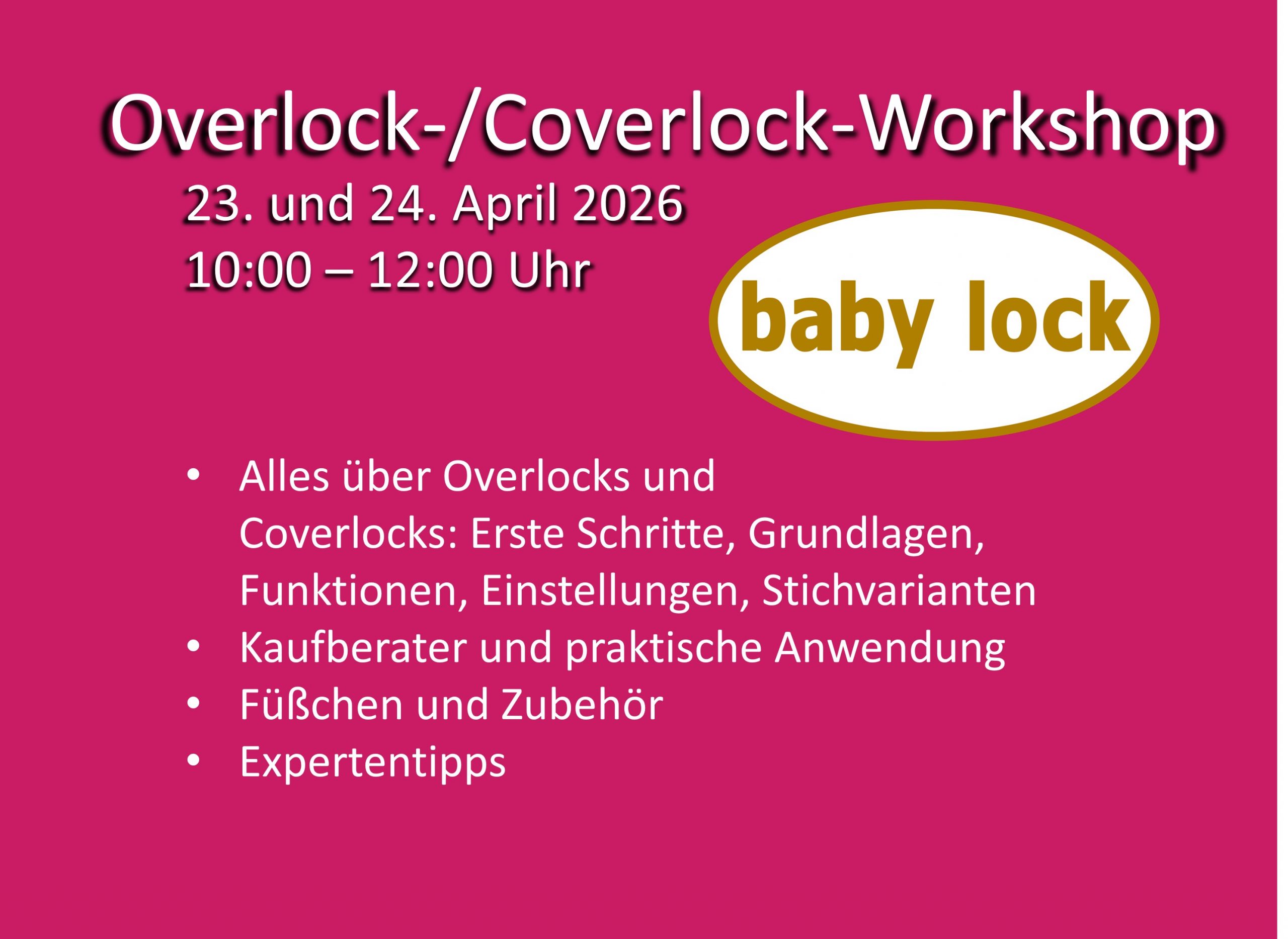 Du hast eine Overlock oder Coverlock von baby lock und möchtest mehr damit machen? Oder denkst Du gerade über eine Anschaffung nach und bist nicht sicher, welche Fakten für Dich wichtig sind? Dann solltest Du unseren baby lock Workshop besuchen. Er vermittelt Grundlagen und Basics für Einsteiger und gibt auch dem routinierten Anwender noch viele hilfreiche Expertentipps zur Hand! Der Workshop wird geleitet von einer erfahrenen Expertin von baby lock, die nur an diesen beiden Tagen zu Gast bei Stoffe Egert ist. Der praxisorientierte, 2-stündige Workshop findet am 23. und am 24. April 2026 um 12:00 Uhr in unserem Geschäft in Fürstenfeldbruck statt. Die Teilnahme kostet € 45,00 (inkl. MwSt.), es sind pro Tag insgesamt nur 5 Tickets verfügbar, pro Besteller kann nur ein Ticket gekauft werden.